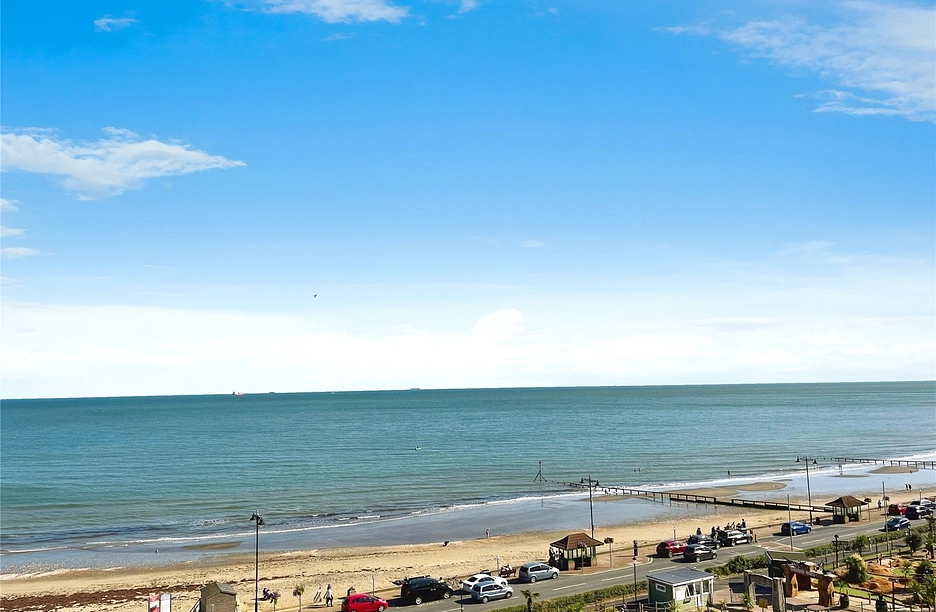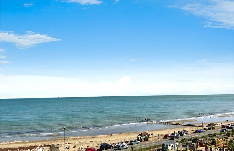 Offered to the market chain free is this spacious and well-presented seaside apartment. The property benefits from an enviable corner position commanding dual aspect sea views across the whole of the bay. The accommodation offers two double bedrooms with built in wardrobes, a family bathroom, large open plan living and dining space complete with well equipped kitchen area. Other benefits include a garage and private balcony. This home combines comfort, style, and an enviable location, making it an ideal seaside retreat.