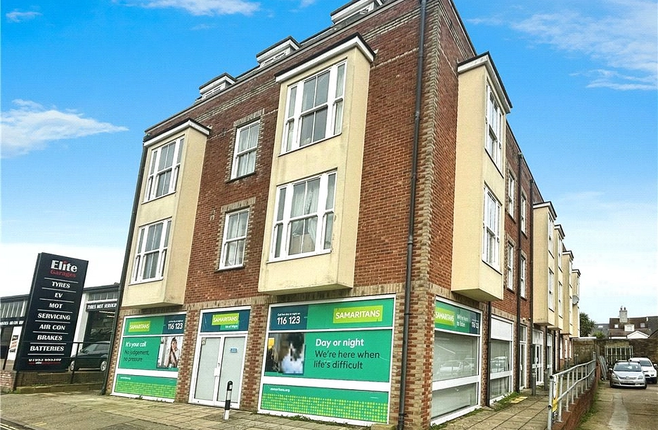 The property is accessed via a communal entrance with stairs leading to the first floor. Inside, the entrance hall provides access to all rooms. The open-plan lounge/kitchen/diner creates a modern and versatile living space, with ample room for seating and dining, complemented by a fitted kitchen area with a range of storage units and worktop space.