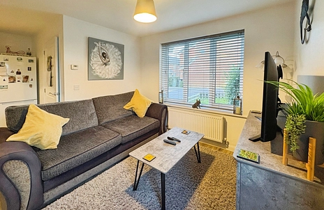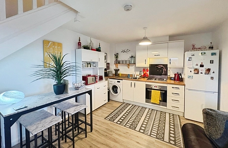 The open plan kitchen/main living area, creates a comfortable and sociable space ideal for both everyday living and entertaining. Large dual-aspect windows flood the room with natural light, enhancing the sense of space. Externally, the property enjoys a low-maintenance garden and offers rear access to a residents’ car park, adding further convenience.
