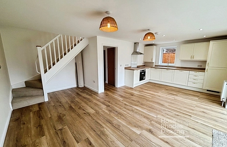 The accommodation comprises an entrance hall leading to two double bedrooms and a handy storage/coat cupboard. The hall then continues to a spacious and light open-plan living/kitchen/dining area perfect for modern family living, with full width sliding doors opening onto the private rear lawned garden with patio area and shed. The appealing fully fitted kitchen comes with all new integrated appliances.