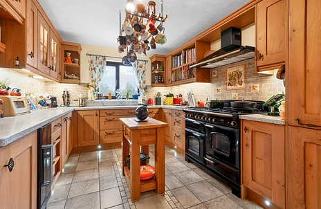 The kitchen offers bespoke French Oak fittings, ample storage, and workspace alongside additional dining space suited to modern family living, complemented by a practical utility room. The study has a bespoke design by Neville Johnson, providing a stylish and functional workspace.