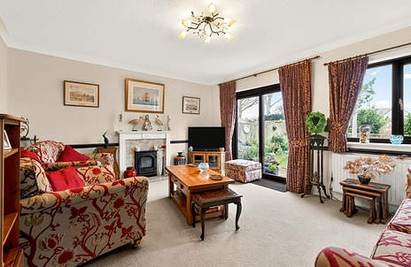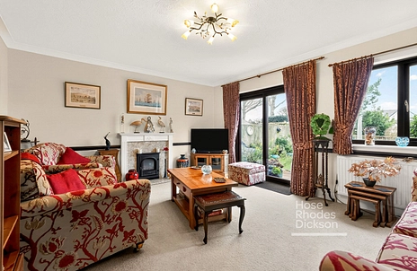 A spacious and welcoming hallway sets the tone on arrival. The living room is generously sized and beautifully balanced, providing an ideal space for both relaxing and entertaining. A separate dining room flows into a bright and inviting sun room, flooded with natural light, featuring underfloor heating and enjoying pleasant views across the garden – perfect for year-round use.