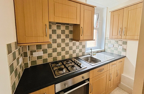 The accommodation comprises an entrance hallway, a spacious double bedroom, a bright living room featuring a large built in storage cupboard, a modern shower room, and a separate fitted kitchen.