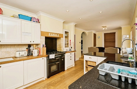 Open plan kitchen and soft seating or breakfast area with doors leading to a large rear paved garden.